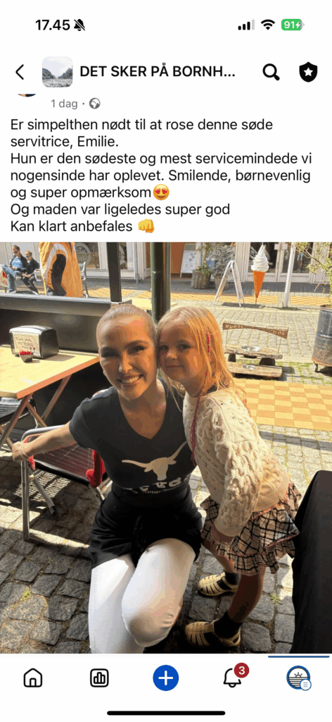 SERVICE: Et opslag i Facebookgruppen “Det sker på Bornholm” er nået ud til næsten 300.000 mennesker – på grund af god service leveret af servitrice Emilie Engell fra Restaurant Texas i Rønne…