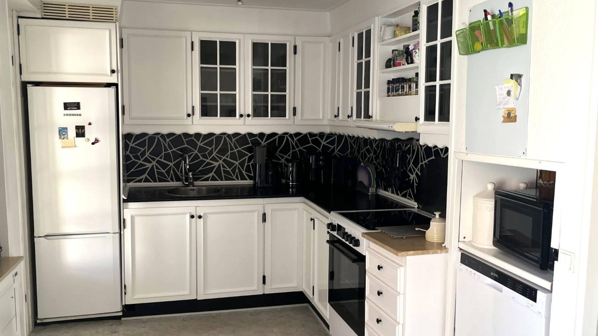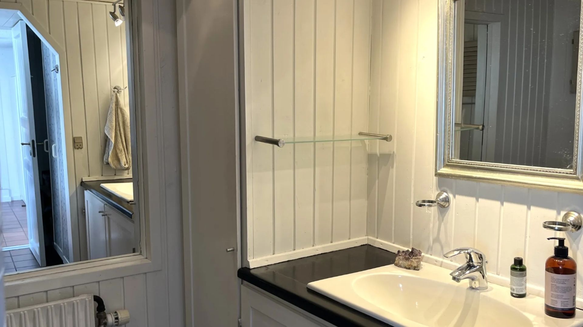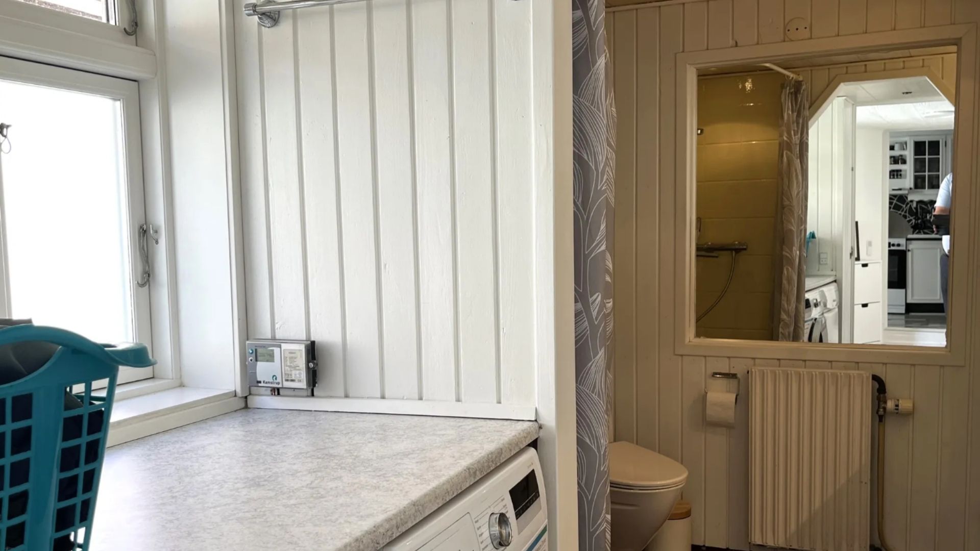 Badeværelse med brus og plads til vaskemaskine/tørretumbler